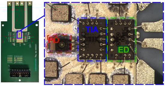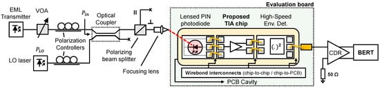 The performance of the proposed TIA was also verified within a quasi-coherent receiver setup. In order to simplify testings, a single-polarization receiver was implemented as shown in Figure 10. An externally modulated laser (EML) is used as a transmitter, followed by a variable optical attenuator (VOA) that controls the optical power entering the receiver (). The received signal is combined with a local oscillator laser by means of an optical coupler. After the coupler, a polarization beam splitter (PBS) separates the combined signal into orthogonal polarizations. The LO is an external cavity laser (ECL) with a linewidth of 100 kHz and an emitted power of 14 dBm (). By means of polarization controllers, the LO polarization is aligned to obtain 50% of the power at each output of the PBS, while the signal polarization is fully aligned to the PBS output being measured. This allows for more accurately relating the obtained system performance to that of a complete receiver implementing polarization diversity, since half of the available LO power is in this case left out, which would be required for the second polarization. The combined LO and signal from the PBS output in use are then focused into a lensed PIN photodiode using a focusing lens. The photodiode has a specified responsivity of 0.8 A/W at 1310 nm (expected to be reduced at 1550 nm) and an opto-electrical (O/E) bandwidth of 37 GHz. The resulting photocurrent is then amplified with the designed TIA and downconverted to baseband with a high-speed envelope detector (ED). Finally, the recovered baseband signal is amplified with a commercial limiting amplifier and processed in a bit-error-rate testset (BERT). The complete chip sub-assembly including PD, TIA, and ED is mounted on an evaluation board as shown in Figure 11, where the individual dies are interconnected by wirebonding. A magnified view of the die sub-assembly is provided in the figure, where the different blocks are identified. The designed TIA chip has dimensions of 0.72 mm × 1.1 mm for a total area of around 0.79 mm2.