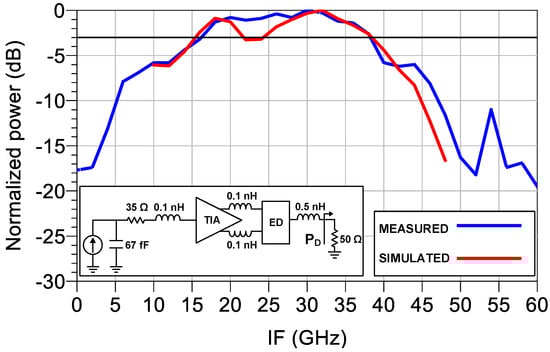 First, measurements to estimate the opto-electrical 3 dB bandwidth of the complete receiver were carried out. Since an envelope detector is present in the receiver, the test is performed by transmitting a narrowband signal consisting of 3 Gbps non-return-to-zero (NRZ) data (minimum bitrate accepted by the EML transmitter). The LO wavelength is then swept, shifting the IF center frequency accordingly, and the output signal from the detector is monitored in a sampling oscilloscope. The curve in Figure 12 shows the detected power as a function of IF center frequency, with a 3 dB response in the range of 16 to 37 GHz. In the figure, the simulated response is also provided. An inset shows the simulation setup, for which the measured TIA response has been used together with a post-layout simulation of the envelope detector. The simulated response includes a photodetector model with associated parasitics, as well as wirebond interconnects modeled as pure inductances. The values for the parasitic capacitance C and series resistance R represent averaged values taken from measured data provided by the manufacturer for the particular chip lot used in the system setup. The wirebond inductance was adjusted in simulation since its actual value cannot be accurately estimated. Using a wirebond inductance of 0.1 nH, good agreement is obtained between measurement and simulation, with a response affected by the bandwidth limiting parasitics from both the photodetector and the chip-to-chip interconnects (pad capacitances and wirebond inductances). An additional HPF with 12 GHz cut-off is implemented in the envelope detector for optimal performance at 25 Gbps bitrates, which shifts the overall lower cut-off to higher frequencies. Further integration of TIA and envelope detector into a single chip is expected to provide improved performance.