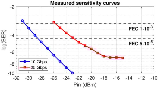 Measurements for the optical receiver sensitivity are reported in Figure 13, with marked lines representing the NG-PON2 forward error correction (FEC) limit (BER = 1 × 10) and the Ethernet FEC limit (BER = 5 × 10). The measurements were performed at 10 and 25 Gbps data rates. For the 10 Gbps case, an EML transmitter was used having an extinction ratio (ER) of 15.28 dB, emitted power of 0.44 dBm, and center wavelength at 1548.75 nm. In turn, the 25 Gbps signal was generated with an EML having an ER of 9.3 dB, emitted power of 2.9 dBm and center wavelength at 1561.48 nm. A sensitivity of −30.5 dBm for the NG-PON2 FEC limit and −28.5 dBm for the Ethernet FEC limit is obtained at 10 Gbps. The 25 Gbps BER curve shows an error floor around 1 × 10, which was attributed to insufficient O/E bandwidth in the receiver. Nevertheless, the receiver can still perform below the FEC limits, achieving −26 and −23 dBm sensitivity for NG-PON2 and Ethernet FEC limits, respectively, thereby improving by 3 dB the results obtained in [11] at 25 Gbps back-to-back.