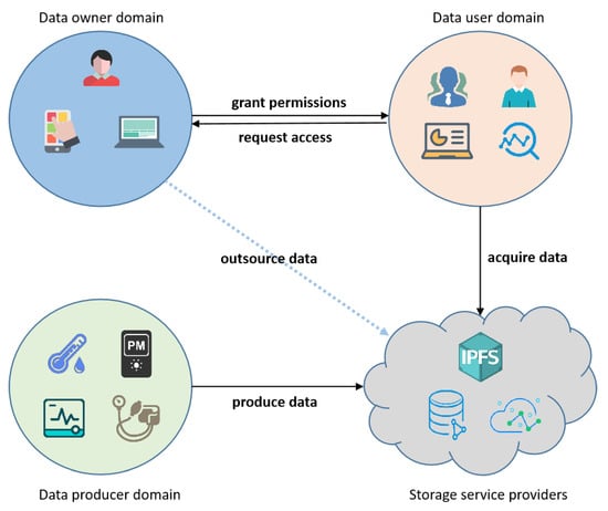 IoT data sharing has played a vital role in smart cities, healthcare, vehicular networks and other application fields [3]. Figure 1 depicts a popular data sharing architecture. The data producer domain contains a series of sensors and other devices that can collect data directly. The data owners generate and manage a large amount of IoT data. Due to the limited storage capacity of IoT devices, these massive data need to be encrypted and uploaded to a third party for storage, which is convenient for data management, distribution and sharing. They can encrypt the data and upload them to the storage service providers, such as cloud servers and distributed file systems for storage. The ownership of the data belongs to the data owner domain. In order to facilitate the sharing of data with other users, access rights are usually bound to the encrypted data itself and outsourced to storage service providers for management. Therefore, it is necessary to establish an effective access control mechanism to ensure the privacy and security of data owners, but this task is usually quite challenging. Data sharing depends on semi-trusted storage service providers, and they may have incentives for trying to read the data. At the same time, the process of authentication and revocation of data access rights is also opaque to the data owners. Since the data are encrypted, the users also lack an entirely credible communication channel to share the decryption key. Moreover, the data sharing depends on storage service providers, which will bring excellent communication overload. If the data owners want to share data with the receivers directly, they need to download the data, decrypt and re-encrypt them for data sharing. This calculation and communication overload is enormous. However, the computing power of the data owners is limited, and they cannot afford to decrypt the encrypted data and then encrypt it to the receivers. Therefore, they can share IoT data with the help of the proxy re-encryption mechanism. In this way, the task of the data owners can be changed from the encryption and decryption process of ciphertext to the generation process of a re-encryption key, which distributes the overload on the data owners.