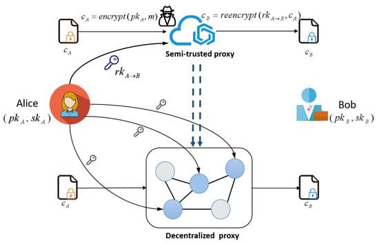 The concept of proxy re-encryption was first proposed by Blaze, Bleumer, and Strauss [4]. It is considered to be an effective cryptographic tool for encrypted data sharing. As shown in Figure 2, in this mechanism, a semi-trusted proxy converts Alice’s (delegator) ciphertext to Bob (delegatee), which can be decrypted with Bob’s private key [5]. In the process of sharing, the data plaintext is not revealed, and the proxy does not need to obtain the private key of either party. However, the single semi-trusted proxy may have malicious behavior in the process of ciphertext conversion. The first risk of this mechanism is collusion between the proxy and the delegatee. Through such illegal means, the delegatee can decrypt data that they do not have permission to access without the consent of the delegator. Another risk is that the single proxy is vulnerable to a denial of service attack. Furthermore, the single proxy may have both a performance bottleneck and a single point of failure.