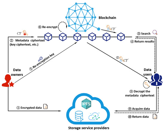 Our proposed method provides a new solution for the encrypted data sharing of the IoT. Figure 3 provides an overview of the data-sharing architecture. In this section, we will explain the participating entities and the workflow design of the data-sharing architecture in detail.