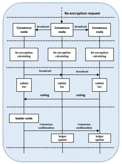 Figure 5. The workflow of data re-encryption processing and consensus confirmation. - The consensus nodes that complete re-encryption calculating in a limited time sign the re-encrypted ciphertext and broadcast them to the blockchain network;