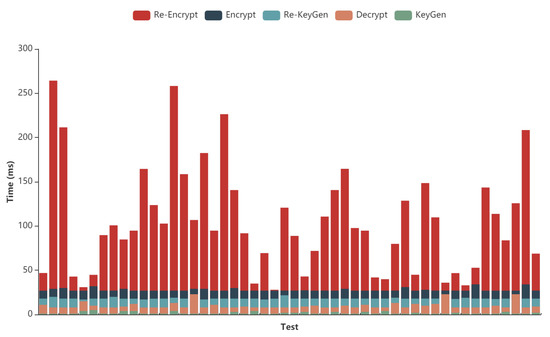 In order to evaluate the time cost of our introducing threshold proxy re-encryption mechanism for data sharing, we have measured the time overload of each stage of the proxy re-encryption mechanism for many times. The threshold proxy re-encryption mechanism can be divided into five stages: key generation, encryption, re-encryption key generation, data re-encryption and decryption. As shown in Figure 6, we can find that the data re-encryption stage takes significantly more time than the rest of the stages, with an average of 98 ms. That is because our data re-encryption process relies on the blockchain consensus mechanism, which takes quite a long time to complete consensus confirmation to ensure data consistency. Compared with the reliability and security of decentralization brought by this mechanism, we believe that this delay is acceptable. The remaining stages are completed at the user side, and the average time overload is less than 25 ms. This load is affordable for users.