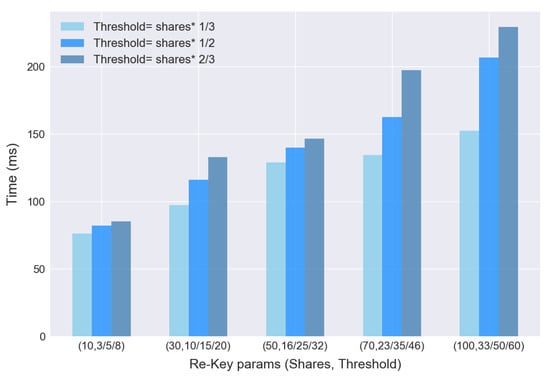 The performance of threshold proxy re-encryption is closely related to two parameters: shares and threshold. In the re-encryption key generation stage, the data owners generate n shares re-encryption keys and send them to n blockchain consensus nodes. These consensus nodes re-encrypt the ciphertext, according to their received re-encryption keys, and generate n converted ciphertexts. When t out of n proxy nodes correctly complete the re-encryption calculation, the ciphertext can be combined to the new ciphertext. The threshold value t represents the minimum shares required to combine the converted ciphertext into a new decipherable ciphertext. Figure 7 shows that the more the split shares of the re-encryption key, the longer time the data re-encryption phase will take. Furthermore, with the increase of threshold, the time cost of the re-encryption process also increases slightly. This result shows that the efficiency of the consensus mechanism based on threshold proxy re-encryption is affected by these two re-key parameters. The more consensus nodes act as proxy server nodes and the more converted ciphertexts need to combine new ciphertexts, the longer the consensus confirmation time will be, and the more time it will take to complete data re-encryption. The reliability and safety of the data-sharing system will also be improved. Therefore, the re-key parameter setting must take into account the two aspects of time overload and safety.