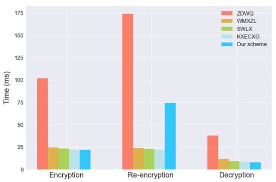 In terms of efficiency comparison, Figure 9 reveals the computation time of each stage of data sharing in various schemes. This figure measured was a result of the average CPU time of 100 executions for each type of operation. In the stage of data encryption and data decryption, compared with other schemes, such as WMXZL [31], SWLX [21], KXECXG [32], our scheme presents slightly less time overload than other schemes. Scheme ZDWQ [33] has obviously higher time consumption because it is executed for a group of users, using the broadcast encryption method. In the stage of data re-encryption, since threshold re-encryption and the consensus algorithm require higher computational overload, the time latency of our scheme is increased significantly, and it is still much lower than the scheme [33].