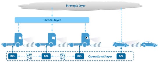 In a V2V enabled platoon, V2V communication, a wireless information exchange between vehicles, mainly takes place in the operational layer, similar to the decision and control logic (DCL) of the Automated Driving System (ADS) of the individual vehicle.