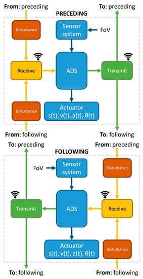 Input-output scheme [] for two communicating vehicles in a platoon where ADS is the automated driving system and FoV is the field of view of the sensor system onboard each vehicle. The figure shows the situation without I2V communication.