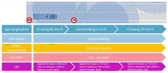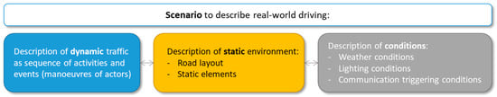 We use scenarios to describe the situations and conditions that a vehicle may encounter on the road during its lifetime. In this way, a trip on the road can be seen as a sequence of scenarios, where scenarios might occur in parallel to each other. In a more formal way, a scenario is a quantitative description of the relevant characteristics and activities and/or goals of the ego vehicle(s), the static environment, the dynamic environment, and all events that are relevant to the ego vehicle(s) within a relevant time interval []. As depicted in Figure 4, this includes: