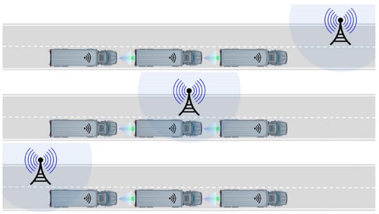 Figure 1 shows the different layers at which communication takes place in a V2V enabled platoon of trucks according to the Horizon 2020 ENSEMBLE project []. Three different layers are considered: the operational layer, the tactical layer and the strategic layer. The operational layer deals with time-critical information exchange (with a time constant in the order of 100 ms or less) to directly control the acceleration/deceleration and steering behaviour of the vehicles. In the tactical layer, additional information exchange between vehicles in the platooning system takes place. This information exchange is less time critical and deals with activities such as engaging in the platoon or disengaging the platoon, which has a time constant of several seconds. The I2V communication usually takes place in the strategic layer, where time constants might be in the order of up to one minute. Typical information that can be communicated is the locally applicable speed limit, the presence of a traffic jam, road works that are upcoming, or an incident that has happened on the route. Typically, navigation systems use the information from the strategic layer.