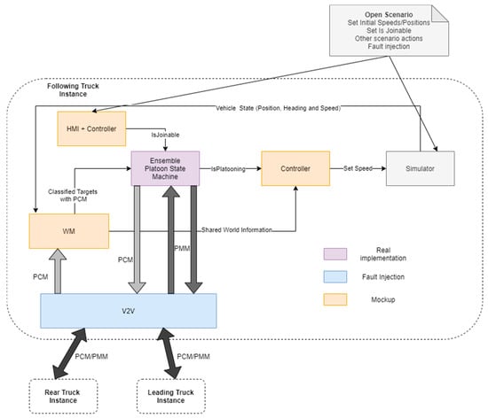 Figure 6 provides a high-level view of the HiL setup, which is based on the implementation for the ENSEMBLE project and which has been extended for the HEADSTART project. The HiL setup covers a three-truck design. In the figure, only the “Following Truck” instance has been detailed. A similar scheme holds for the Leading Truck and the Rear (or Trailing) Truck instance. The actual implementation of the ENSEMBLE platooning functionality is indicated by the purple box. This implementation offers the functionality needed for platoon manoeuvring, coordination, status updates and exchange, etc., supported by the specific V2V platooning messages: Platoon Control Message (PCM) and Platoon Management Message (PMM) []. The blue box represents the exchange of V2V messages between the trucks in the platoon. The orange boxes are related to world modelling (WM, sensor simulation and fusion), vehicle control and human machine interaction (HMI). The simulator box in grey is for simulation control and relates to the simulator environment (e.g., visualization and test automation using scenario files). The blue box in the figure is extended with I2V communication and fault injection capabilities, as part of the generic test execution.
