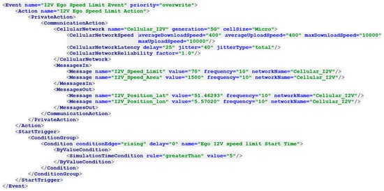 OpenDRIVE (ODR) and OSC files are used to describe the static and dynamic environment for a test case []. An OSC file describes manoeuvres of vehicles in a storyboard. The vehicle manoeuvres are described by vehicle activities (e.g., accelerating, braking, changing lanes) that are triggered by specific conditions (e.g., vehicle speed, distance, position). Currently, the OSC file format does not support the description of the effect regarding V2X communication in test cases.
