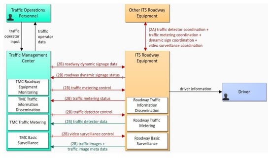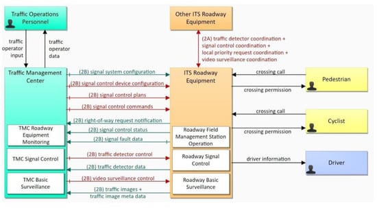 The ITS traffic control system architecture proposed did not include the other actors (pedestrian and cyclist) suggested by ARC-IT architecture (Figure 1 and Figure 2), because they have a very low degree of interaction with the traffic control system in the target context. The actors who want to cross the street near a high traffic intersection use elevated pedestrian bridges, or the pedestrian crossing zones located before the traffic signal, at the times that it is possible for them to cross.