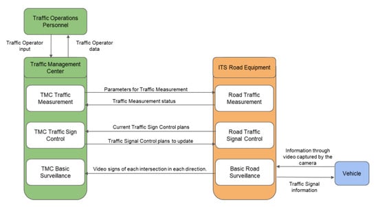 Figure 3 presents the proposed architecture for the TSCS, which considers results of the systematic review of literature, and the reviewed ITS reference architectures. Three of the components used in the TM03 and TM05 ARC-IT services are included: ITS Roadway Equipment, Traffic Management Center (TMC) and Vehicles (presented as Driver in ARC-IT). The traffic measurement, traffic signal control, and basic road surveillance modules are also included. The three components of the proposed ITS architecture allow traffic monitoring, data, and video collection, determination of the best traffic signal times for a given intersection, and programming of the traffic signals phases of any intersection.