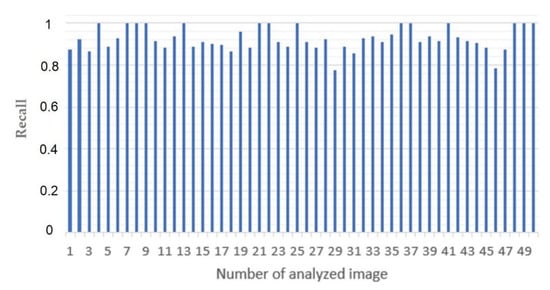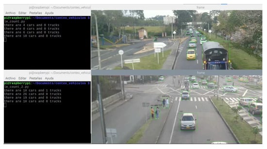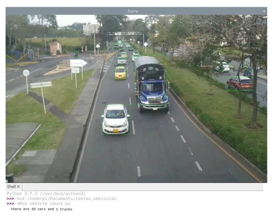 - The Road Traffic Measurement (ITS RE RTM) module reviews video signals of current traffic in each direction of the intersection and counts the waiting vehicles (queue size), for this it captures an image periodically, detects and count the waiting vehicles using a computer vision algorithm. The used algorithm was an adaptation of the YOLO v3 algorithm []. An example of the vehicle counting performed by the algorithm is shown in Figure 5. YOLO version 3 is a real-time object detection system that, unlike other systems such as Region-based Convolutional Neural Networks (R-CNN), applies a single neural network to the entire image. This network divides the image into regions and generates bounding boxes and probabilities for each region, making this system 100 times faster than Fast R-CNN [].