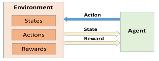 The RL process is explained in Figure 6. The figure identifies the mentioned elements (states, actions, reward, and environment). The agent initially reviews the system environment (current state and possible actions), then decides which action to take (among the possible ones defined in the environment), executes the action, and in response receives a reward and a new state. This process is repeated continuously until an optimal state is achieved.