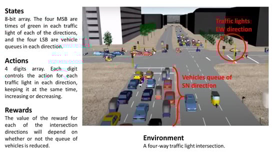 The definition of the state and the reward for applying RL to traffic signal control show is a key issue. Regarding the reward, it is important to consider the ultimate objective in urban transportation: minimizing vehicle travel time [,]. Travel time is influenced not only by traffic signals, but by other elements such as queue length, waiting time, speed, throughput, and delay. Each one of these elements could be considered to define an adequate reward. Previous studies use combinations of these elements (such as [,,,,]) to try to establish an adequate reward. Regarding the state, elements such as queue length, waiting time, volume, delay, speed, phase duration, and congestion are considered to represent the states in traffic signal control [,]. Some proposals combine two or more of such elements or use novel elements such as images to represent the states, which results in a state with high dimensionality representation. In such cases, state approximation techniques such as tile- and coarse-coding, neural networks, etc., are considered.
