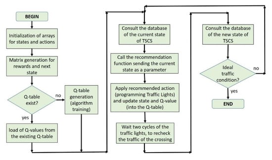The proposed TSCS only considers the Q-learning algorithms, because one of the objectives of the work was to find an adequate traffic control option that would facilitate implementation in the considered context. Q-learning algorithms allow the implementation of RL without a steep increase of system complexity in terms of required components for information collection.