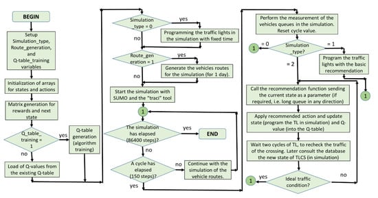 - The development of the RL algorithm for recommendation of traffic signal times in a way as simple as possible, with basic parameters and a short execution time. Most proposals found use RL with multi-agent and/or deep learning, which increases system complexity.