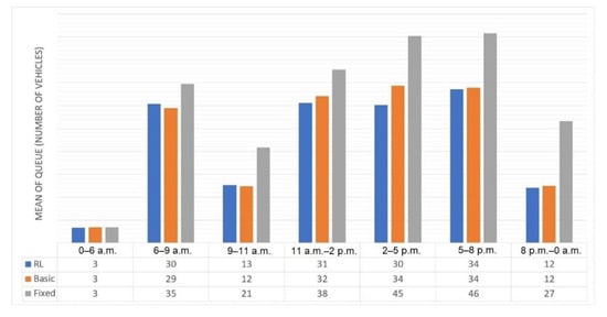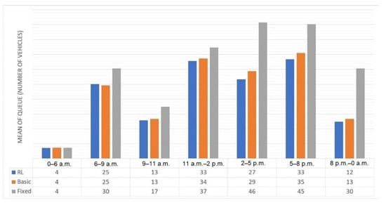 The hyper-parameter values of the RL recommendation time algorithm were modified, seeking the best results in the simulation in terms of vehicle queue length. The values of the hyper-parameters yielding the best results were alpha = 0.6 and gamma = 0.4.