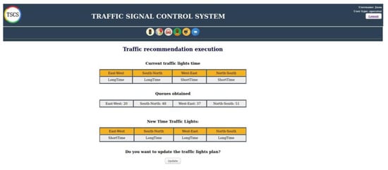 Once the algorithms were independently tested, real-time integration tests were performed to determine if the response time was adequate. The results obtained showed that the maximum delay time between the start of the measurement of the four vehicle queues and the values being recorded in the database was 2.59 s on average, for the 20 tests performed. The response time mean of the time recommendation algorithm was 7 s. These times were considered adequate, because the time of a traffic signal cycle is approximately 150 s and the period between queue measurement is approximately 20 s. The system operator (TOP) can request for the execution of the time recommendation algorithm at any time, which has as input information from the vehicle queue (data collected 23 s ago or less), and the response is obtained in approximately 7 s.