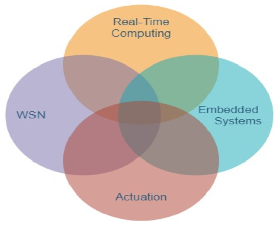 “Internet-of-Things” is a term coined by Kevin Ashton of Proctor and Gamble in 1999. IoT since then has progressed rapidly into a field that necessitates the interaction of objects which have embedded sensors, processors and can communicate with fellow devices to furnish the various automated services [3,9,10]. IoT is not a single technology. It is a confluence of real-time computing, actuation, embedded systems, and, most important, WSN, shown in Figure 1. In our day-to-day life, there are various IoT standalone devices such as smartphones, smartwatches, home lighting [11], etc. The upcoming future of IoT will aim to use smaller and energy-efficient sensor technology along with state-of-art communication, data analytics, and advanced actuators to collect and process data more intelligently [11,12]. IoT implementation will increase energy management at homes and industry, monitoring consumables, fitness monitoring, etc., is anticipated to become ubiquitous [13,14].