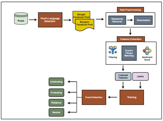 Our proposed model includes data collection, language detection, data pre-processing, feature extraction, model training, and event detection steps. These steps are depicted in Figure 1. This model allowed us to detect celebrating, protesting, religious, and neutral events after analysis of Bengali and Banglish Facebook posts’ text. ‘Celebrating events’ include marriages, cultural events, and etc. Student or human-chain protests (a demonstration of individuals who form a chain structure by holding hands for showing solidarity [3,4]) or rallies were classified as ‘protesting events’. Eid celebrations, funerals, venerations, and etc. were classified as ‘religious events’. Any events outside these frameworks were deemed ‘neutral events’.