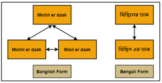 Since Banglish may include multiple representations of a word, all possible combinations of the relevant words were identified and used in this work. Figure 2 describes this multiple representations of Banglish words.