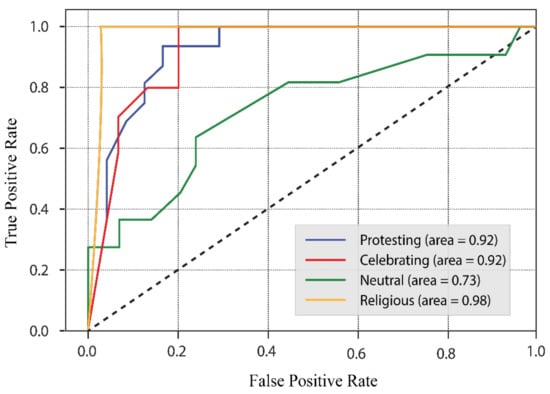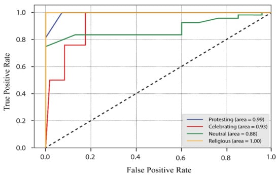 Figure 4 presents the AUC-ROC curve of the BNB model as it detected events on the basis of Facebook posts written in Bengali. Celebrating (AUC = 0.93), protesting (AUC = 0.99), religious (AUC = 1.00), and neutral (AUC = 0.88) events are presented as red, blue, orange, and green lines respectively. Based on these scores, the BNB model performed well at detecting events since AUC values are closer to 1. The nearer the value of AUC to 1, the better the model’s performance.