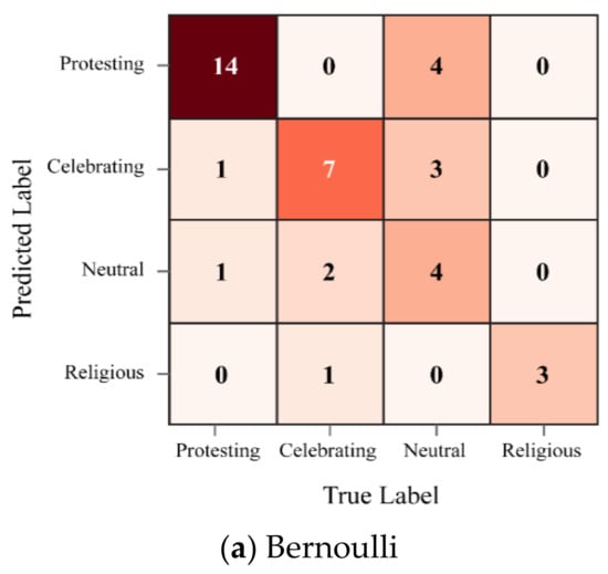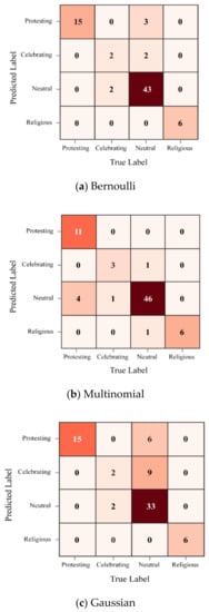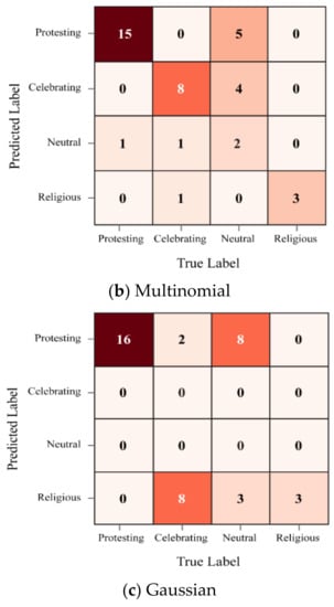 Figure 5 presents the Bernoulli, Multinomial, and Gaussian NB models’ confusion matrices. Protesting, celebrating, neutral, and religious events are referred to by the numbers in the 1st, 2nd, 3rd, and 4th column respectively. The diagonal values in the matrices are the true events detected by the NB Classification model while other cells express the number of false-positive events. Overall, Figure 5 suggests that the BNB model outperformed the comparators.
