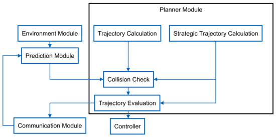 The environment model provides an object list with all surrounding objects. The object list is passed to the prediction module. Objects that are V2X-capable are assigned the planned and, if necessary, desired trajectory by the MCM. For these, no prediction is necessary. For non-V2X objects, the planned trajectory is predicted. Schubert et al. [67] compared methods for predicting vehicles, but the models are only valid for short time horizons. For the maneuver planner, however, longer planning horizons of, e.g., 10 s are needed. For this reason, prediction is performed as in [68]. The assumption is made that objects move along the current lane with constant velocity. The object information with the trajectories is passed to the planner module.