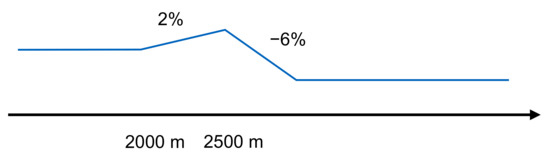 In Section 1, uphill driving was identified as a problem with eco-driving. For this reason, a road with a hill of 2% incline and 6% decline was selected. On inclines at more than 2%, trucks may experience a drop in speed due to their heavy weight or from being underpowered [75]. Koy and Spacek [76] have shown that even with high engine power and large gradients between 4% and 8%, constant cruising at 80 km/h is not possible. At a gradient of 2%, the selected truck with 40 t can still drive over the hill at 80 km/h. According to §18 of the German Road Traffic Regulations (StVO) [39], 80 km/h corresponds to the maximum permitted speed for trucks on German highways. 40 t corresponds to the permissible total mass for trucks in Germany according to Road Traffic Licensing Regulations (StVZO) §34 [77]. At a gradient of −2%, using Equation (2) and parameters from Fries [73], a 40 t truck is accelerated by the downslope force with only 0.097 m/s2 at 80 km/h, while a 13 t truck is decelerated even with −0.002 m/s2. In order not to avoid an excessively long coasting process, a slope of −6% gradient was chosen. Figure 2 shows the elevation profile of the track. It should be noted that without driving resistances, the truck would absorb energy when passing through the track because the potential energy at the end is lower. However, this is not important for the investigations since individual variants are compared with the same route profile.