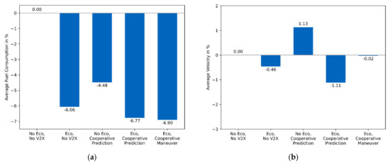 In contrast to Section 4.3.1, three trucks were considered instead of two in the otherwise same scenario. Table 4 shows the absolute, and Figure 4 the relative average fuel consumption per vehicle and the average velocity.