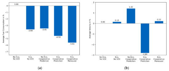The worst consumption is achieved with no energy-efficient driving and no communication, while the best consumption is achieved with eco-driving and cooperative maneuver coordination with planned and desired trajectories. It can also be seen that besides cooperative maneuver planning, cooperative prediction achieves an advantage in eco-driving. The improved fuel consumption is due to coasting, where hardly any fuel is consumed. However, coasting increases the travel time, which is evident from the lower average speed. The highest average velocity in eco-driving is achieved by cooperative maneuver planning, although the lowest fuel consumption is achieved here. This can be explained by the fact that the deceleration of the second vehicle is minimized by a later coasting maneuver of the first vehicle.