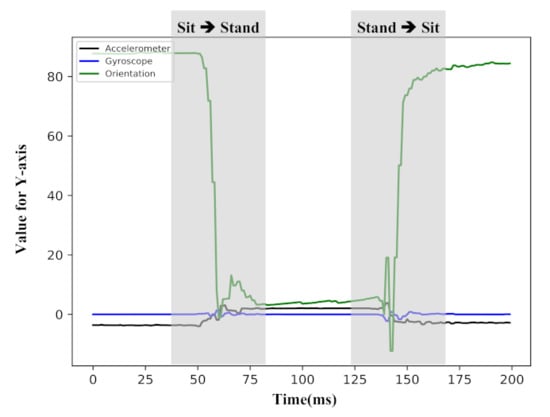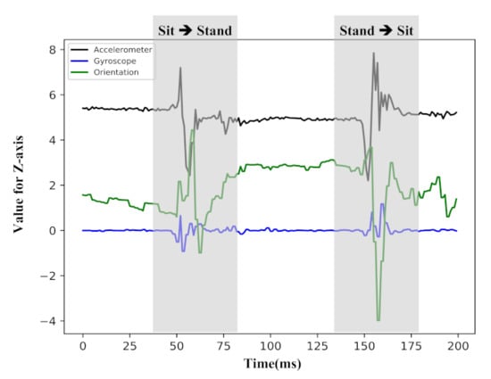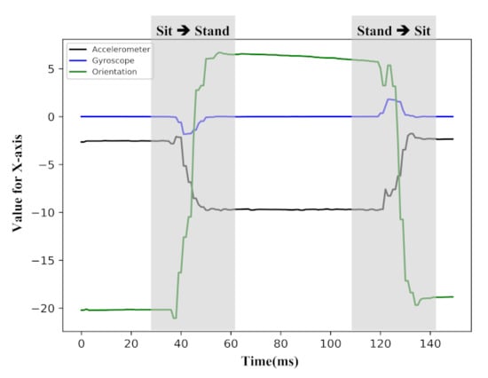 The process of the system architecture is as follows. The smartphone periodically collects sensory data from its various sensors and collects wireless signal information from surrounding APs. The user activity is largely classified into six activities: walking, running, sitting down, standing up, putting on and falling down. The sensors embedded in smartphones that are used in E-IMS are the accelerometer, gyroscope, and orientation and magnetic sensors. These four sensors are not only representative sensors that can sense the movement of a smartphone user in the field of human activity recognition (HAR) through smart devices but are also sensitive to the user’s movements. The user’s smart mobile device listens to advertising signals disseminated from APs around its own. Then, it extracts the RSSI value and identification for the advertiser from the received signal. Next, the smart mobile device delivers these data to the edge server. In the edge server, these data are used to predict the user’s activity and location. Figure 2, Figure 3 and Figure 4 illustrate that smartphone sensors sense a given user’s activity change. The figures show the change of each value is definite whenever the activity of the user is changed. E-IMS learns RSSI and sensory data by machine learning, and then detects the current user state via prediction of the user activity and location based on the data.