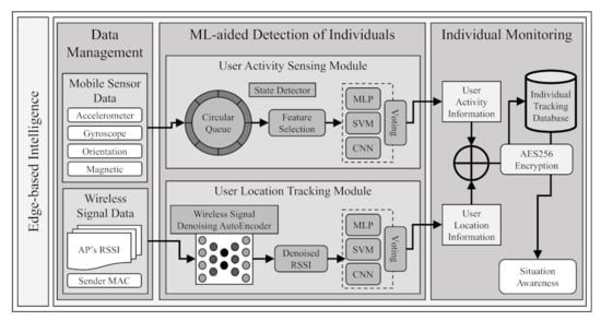 As a second step, in the ML-aided detection of individuals (MLaDI) part, sensory data and wireless signal data are processed by two different modules: a user activity-sensing module and a user location-tracking module. The user activity sensing module processes the sensory data collected from smartphones. This module reconstructs data through feature selection from the collected data. The reconstructed data is entered to the pre-trained MLP, SVM, and CNN models to predict user activities. The user activity-sensing module (UASM) determines the user’s current activities through a hard voting process based on the results predicted by the pre-trained models. The user location-tracking module (ULTM) processes a number of wireless signal data collected from mobile devices. In this module, wireless signal data is entered to the pre-trained DAE (denoising auto-encoder) model to filter out the noise present in the wireless signal data. Denoised RSSI data generated through the DAE is entered to the pre-trained MLP, SVM, and CNN model to predict user location. The user location-tracking module determines the user’s current location through hard voting on the results predicted by the pre-trained models.