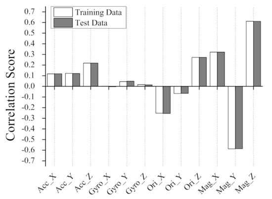 Figure 6 shows the correlation coefficient between training data and test data. The training data and test data are composed of X-, Y-, and Z axis values from four sensors: the accelerometer, gyroscope, orientation sensor, and magnetic sensor. The X-axis in Figure 6 represents 12 features (axis values for each sensor). The Y-axis represents the correlation score and indicates a measure of the correlation between axis values for each sensor. In Figure 6, the correlation coefficient values are different from each other in terms of features. Meanwhile, the correlation coefficient values between training data and test data in each feature are similar to each other. In other words, it can be interpreted that each feature of the train data and test data has a similar distribution. The detector finds meaningful data through the feature selection process using the Pearson correlation coefficient, and the meaningful data are generated as input data of machine learning. The detector predicts user activity by entering the reconstructed data into the pre-trained model. To detect a change of activity, the detector compares a user’s previous activity with their current activity.