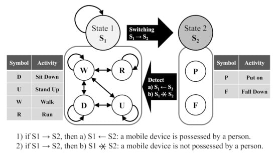 Figure 7 illustrates the state diagram to detect the coexistence of both a person and their mobile device, i.e.,a smartphone, smart tablet, etc. The states are divided into two groups: and . Each group includes predefined user activities. As an activity group related to when the mobile device is possessed by a person, the group consists of four activities such as walking (W), running (R), sitting down(D), and standing up (U). consists of two activities, e.g., putting on (P) and falling down (F) as an activity group indicating when the mobile device is not possessed by a person. Furthermore, the user activities in each state group can be divided into continuous and discontinuous activities according to the cycle of activity occurrence. For example, walking and running in are continuous activities. These activities mean a person is moving without stopping while the person still has his/her own smartphone. On the other hand, sitting down and standing up in are discontinuous activities. These activities mean a person maintains a stationary state after a short movement from their previous activity. Putting on and falling down in are also discontinuous activities, but these mean a person does not possess his/her own smartphone. The way to distinguish between and among discontinuous activities is to find out whether the user possesses a smartphone or not. For this, the detector compares the previous activity with the current activity to detect state changes between continuous and discontinuous activities. If a discontinuous activity occurs after a continuous activity, the user’s state is determined according to the next action predicted by the detector. This can be classified into three cases that can determine the user’s state. Case 1 means the user’s state maintains while possessing their smartphone. Case 2 means the user’s state returns to after the state changed from to previously. Unlike Case 2, Case 3 means the user’s state does not return to from . These three cases can also determine whether the user has a smartphone or not. In the E-IMS, if a user’s state is Case 1 or Case 2, it is determined that the user’s final state is , and the algorithm decides that the user has a smartphone. In case of Case 3, the final state of the user is determined as , and the algorithm decides that the user doesn’t have a smartphone.