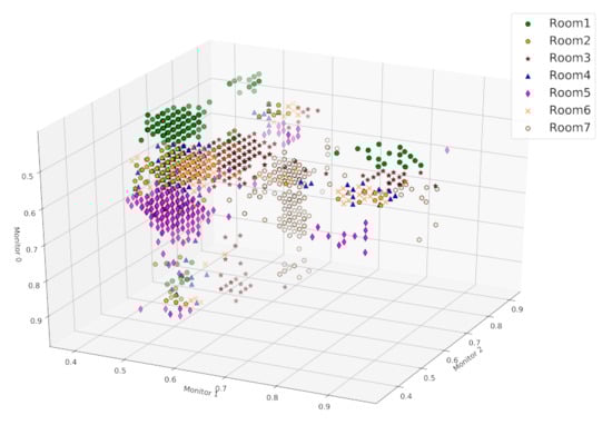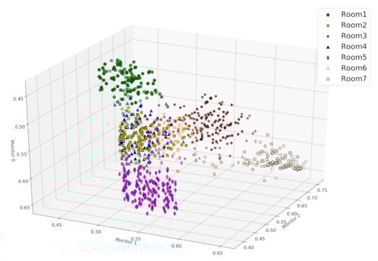 The RSSI sent to the edge contains some fluctuated values due to the nature of the wireless medium. Figure 8 shows RSSI obtained from three monitors in rooms 1, 2 and 6. Fluctuate values are not clustered and are scattered. These values are filtered through DAE. Figure 9 shows the result of the DAE, and most of the fluctuated values has disappeared. In order to attain indoor localization, SVM and MLP are performed using the RSSI. SVM uses the RBF kernel and MLP has three hidden layers. Finally, the scheme predicts the indoor position of the STA by hard voting the results.