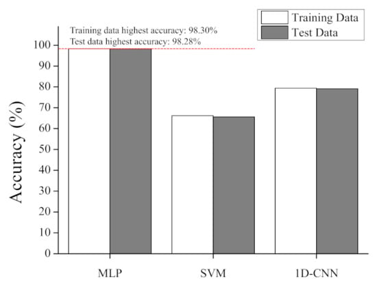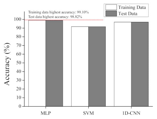 Figure 10 shows the accuracy of the state (putting on and falling down activities). First, MLP demonstrated an accuracy of 98.30% for training data and 98.28% for test data. Second, SVM demonstrated an accuracy of 66.19% for training data and 65.65% for test data. Finally, CNN demonstrated an accuracy of 79.42% for training data and 79.11% for test data. Consequently, the best accuracy is 98.28% in MLP with test data. Figure 11 shows the total accuracy for all user activities. The accuracy of MLP is 99.1% for training data and 98.82% for test data. The accuracy of SVM is 91.67% for training data and 91.65% for test data. In the case of 1D CNN, the accuracy is 96.93% for training data and 96.94% for test data. Similar to , MLP showed the highest accuracy.