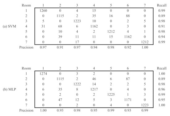 This experiment has performed based on two to three monitor devices in order to classify the seven rooms. Then, two machine learning schemes, i.e., SVM and MLP, are employed to analyze the RSSI data collected from monitor devices. The set of data used on each machine learning scheme is equal. The accuracy of indoor positioning is higher when using three monitor devices than using two monitor devices; the greater the number of monitor devices, the more RSSI is collected from the monitor devices. Finally, the amount of data increased the performance of the machine learning technology. Therefore, as the number of monitors increased, the amount of data also increased. Figure 12 presents the confusion matrix of machine learning schemes SVM and MLP with DAE. Figure 12a shows that the average accuracy of localization when incorporating SVM is 95.60%. Figure 12b shows that the average accuracy of localization when incorporating MLP with DAE is 96.70%.