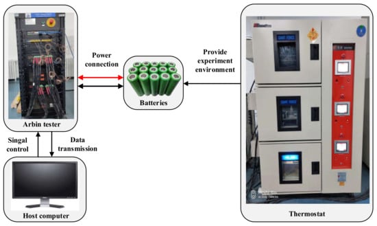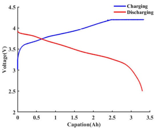 The experimental platform for lithium-ion batteries testing is shown in Figure 1, which is mainly composed of three parts: The Arbin battery test system (BT-5HC 5V-60A) for battery charging and discharging, the host computer for programming and saving experimental data, and the thermostat used to control the temperature. Firstly, the new battery was performed three times using the experimental platform, including the constant current-constant voltage (CC-CV) charging and constant current discharging. The current during constant current charging and discharging is 1/3C, where 1C denotes that the current is equal to the nominal capacity in value. The C/3 (1.1A) charging and discharging curves of the lithium-ion battery are shown in Figure 2. Then, the batteries are respectively charged to the specific SOCs with a 1/3C constant current: 0%, 25%, 50%, 75%, and 100% (fully charged). All the experiments are carried out in the thermostat at 25 °C.