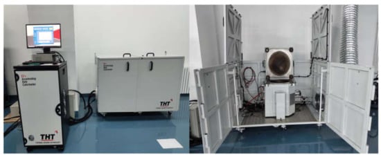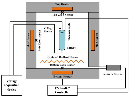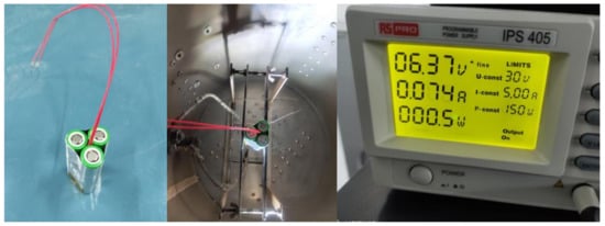 In this study, the thermal runaway experiments are all carried out in the extended volume plus accelerated rate calorimeter (EV+-ARC) produced by the THT Company (London, Britain), as shown in Figure 3, which is the latest product. Its volume is much larger than EV-ARC and the other calorimeters, which is more suitable for batteries’ safety experiments such as TR. In the study of batteries’ thermal safety, the temperature rise (δT) and energy (δQ) can be linked through the specific heat capacity of the battery, as shown in (1). Therefore, before conducting the thermal runaway experiment of the batteries with different states of charge, the specific heat capacity of the battery is measured using the direct current (DC) constant current source and EV+-ARC. The polyamide heater is placed in the middle of the three batteries to ensure the batteries are heated evenly, and then it is placed in the calorimeter, as shown in Figure 4. After the EV+-ARC enters the adiabatic mode, the batteries are heated using the constant current source. The specific heat capacity of the batteries is 1020 J/kg/K, which is calculated by (2).