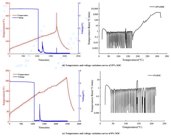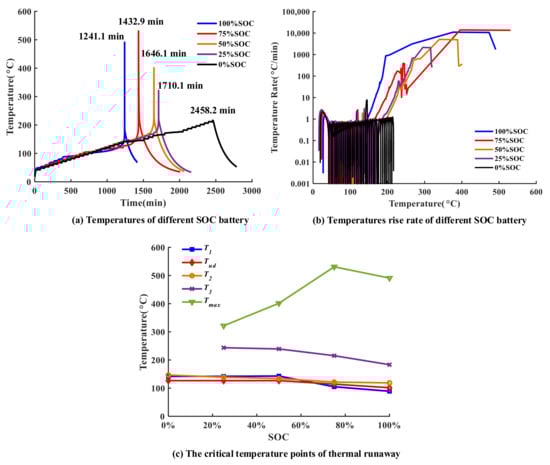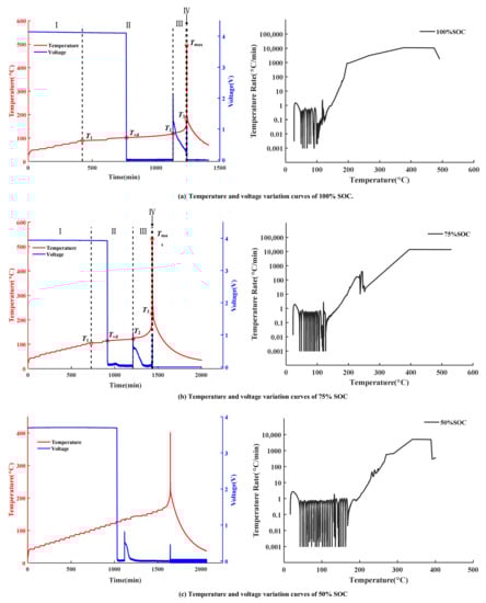 The temperature and voltage change curves of the batteries with different SOC conditions during the TR process are shown in Figure 6. It can be seen from the curves with 100% SOC in Figure 6a, that the TR processes could be divided into four stages with three critical temperatures.