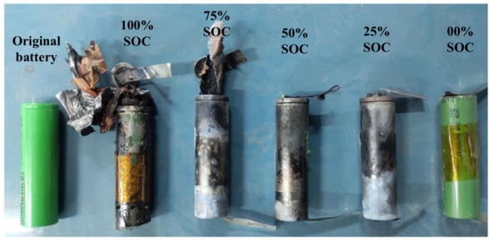 Figure 8 shows the appearance of the fresh battery and the battery under different SOC conditions after the TR. In containment systems, the high pressure generated by the gas released from the battery can damage the vent, and this effect is exacerbated as the SOC increases. At 100% and 75% SOC, the battery explodes, rupturing its container and burning its shell. The electrolyte and some of the electrode material inside the battery eject from the positive electrode, thus the mass loss is higher than under the other conditions.