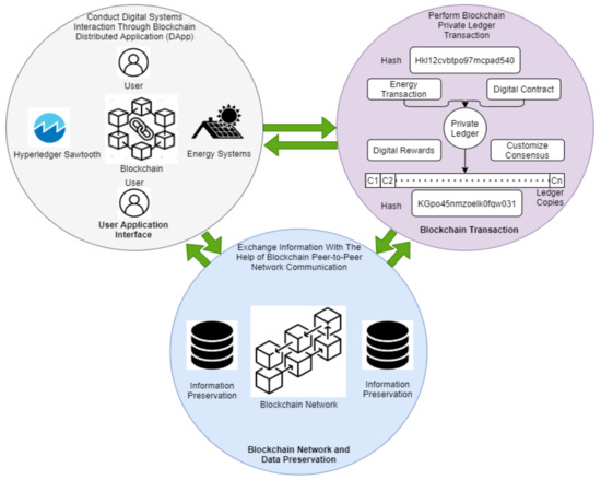 Blockchain technology has been widely adopted as a decentralized system that provides security and privacy of distributed energy systems control operations of power node transactions [11]. The technology serves various potential advantages in cyber-physical power management and control monitoring development, such as a high node transactions transparency and an easy way to be rid of complex two-way power management, monitoring, and related vulnerabilities [12]. It would also provide the distributed blockchain-aware serverless peer-to-peer (P2P) network with microgrids of renewable energy; blockchain-enabled development can cover several gray areas, including technological, economic, social, and environmental dimensions. Furthermore, there is no additional cost for permanence, and a high level of privacy security pertinent to store energy-related information and control accessibility [13]. For instance, the modular blockchain business models (consortium), including the Hyperledger Sawtooth, act as a permissioned private distributed network architecture. The Hyperledger Sawtooth-based customized (programable) smart contracts guaranteed by blockchain, automate rule-based transactions execution and security. It also allows to design and create a seamless hash encryption, which supports the general-purpose programming language for maintaining a trustable private network and pluggable consensus protocols effectively and efficiently. Through the experiment, the hash-encrypted power node transaction is formed in chronological order and it achieves various benefits in the domain of distributed energy management and control, such as reducing the peak load, increasing economic savings, market trading efficiency, and avoiding third-part administrative barriers and authenticity.
