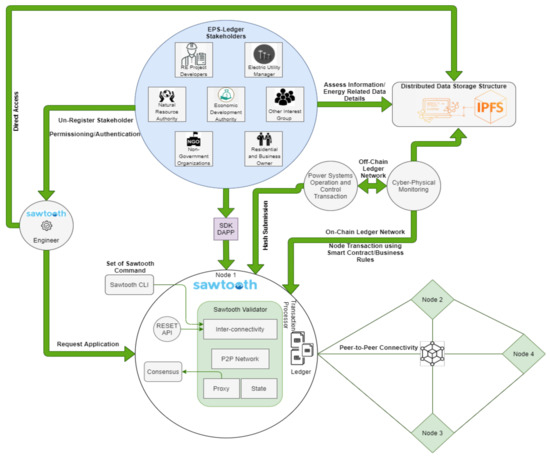 In this section, we proposed a blockchain Hyperledger Sawtooth-enabled novel and secured an architecture for distributed renewable energy and power systems chain of control operations of node transactions and distributed monitoring. Figure 4 presents the EPS-ledger blockchain Hyperledger Sawtooth architecture that enabled the renewable energy systems operation, control, and management of power in the secure monitoring context, including the multimachine system, competitive environment, billing, settlement, and reliability. This architecture demonstrated the proper scenario of renewable power monitoring between various node transactions’ integrity and the secure preservation in the distributed ledger; moreover, it maintained a consensus policy for update transactions and encrypted using hash SH-256 and stored these transaction updates in an IPFS distributed storage. The participating stakeholders (register() contract) directly accessed the IPFS storage and checked the power management details, submitted approval for the transaction, applied for the request for cyber-physical operation and controlled the monitoring and billing settlement through the distributed application (DApp). A Sawtooth engineer tackled the request of all participating stakeholders related to access records. In this regard, the engineer also handled a set of logs in the distributed storage structure and managed the energy-related data redundancy and validation challenges. Whereas the objective of the IPFS storage structure is to provide a secure preservation of renewable distributed power systems control node transaction records, it also allows for the setup of timely update transaction reporting, documenting, and exchange data among participating stakeholders.
