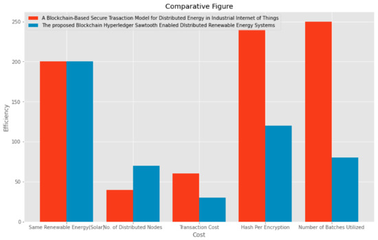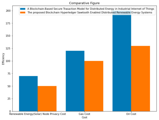 The proposed chain of control node transactions presented the individual transaction verification that required less amount of time to validate, as shown in Figure 12 and Figure 13. With the number of power operation transactions having increased, the execution cost exceeded exponentially, maintaining the performance of the blockchain distributed node transaction by applying the experiment using Hyperledger, whereas Hyperledger Sawtooth validator completed the energy-based transaction verification and validation as the minimum time cost effectively. The simulation-based experimental results showed that the performance (in terms of efficiency and security) of this proposed architecture were more efficient than the other public permissionless state-of-the-art non-blockchain-based unsecure models. Figure 12 presents that compared with the blockchain-based secure transaction model for distributed renewable energy in the industrial Internet of Things using a Bitcoin transaction algorithm, which executes the transaction verification and validation process with security [38]. J. Hou et al. presented an architecture that decreases the energy-related transaction verification cost and design consensus, but cannot consider the wallet-freezing problem. Undoubtedly, it is a secure architecture for energy-related distributed transaction verification and validation, but less efficient along with consuming a wider scope of data cost and privacy and computational power, as shown in Figure 12 and Figure 13.