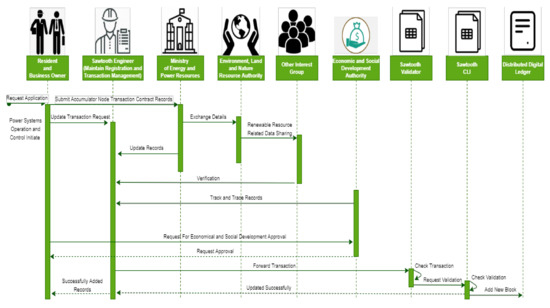 Figure 14 presents the blockchain Hyperledger Sawtooth-enabled EPS-ledger renewable energy identification, registration, validation, and verification process. The initial process was executed between the residential and business owner and the Ministry of Energy and Power Resource, once the consensus reached the point of record registration, in which both the participating stakeholders interacted and signed with the level of encryption. After that, the residential and business owners received the updated ledger from the ministry; then, the business rule updated the information using updateTransaction() and stored in the distributed IPFS storage shown in Figure 14.