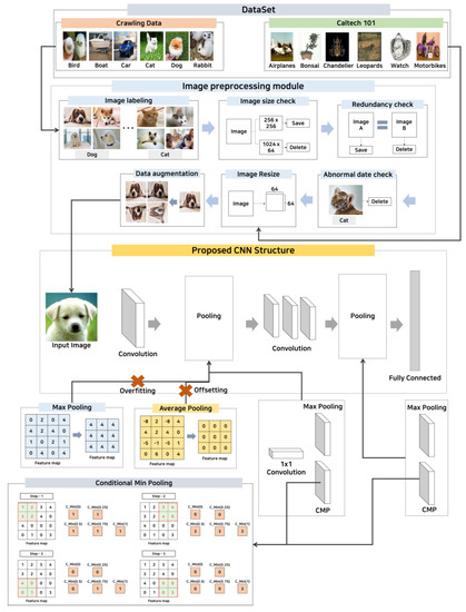The dataset is crawling data and Caltech 101. Crawling data go through the entire process of the image preprocessing module, and Caltech 101 data go through image resize and data augmentation. The data passed through the image preprocessing module is delivered to the CNN input. The CNN that receives the image extracts a feature map using convolution and pooling to proceed with classification. Pooling uses the proposed pooling structure and CMP because it can cause overfitting and offsetting when max pooling and average pooling are used.